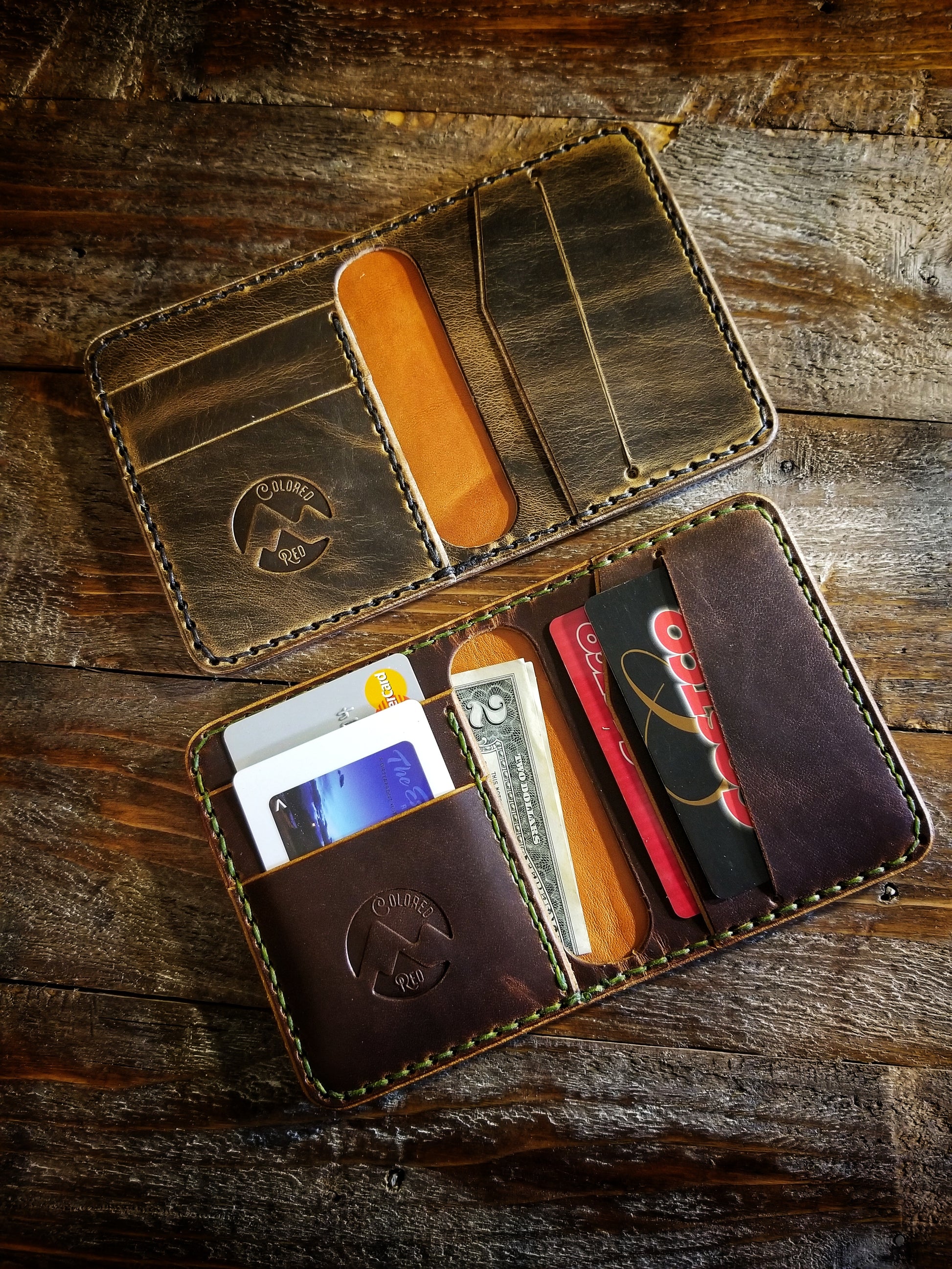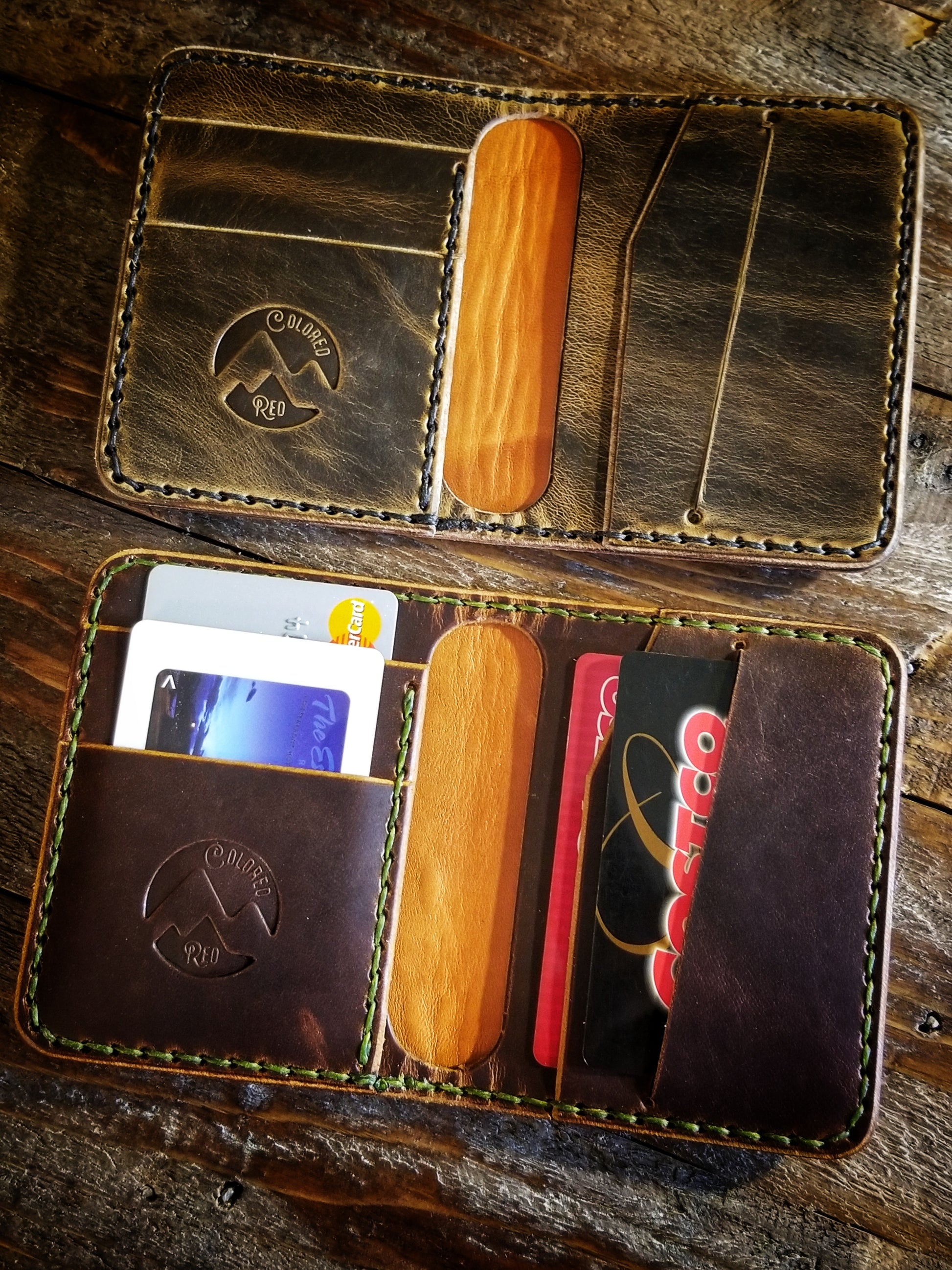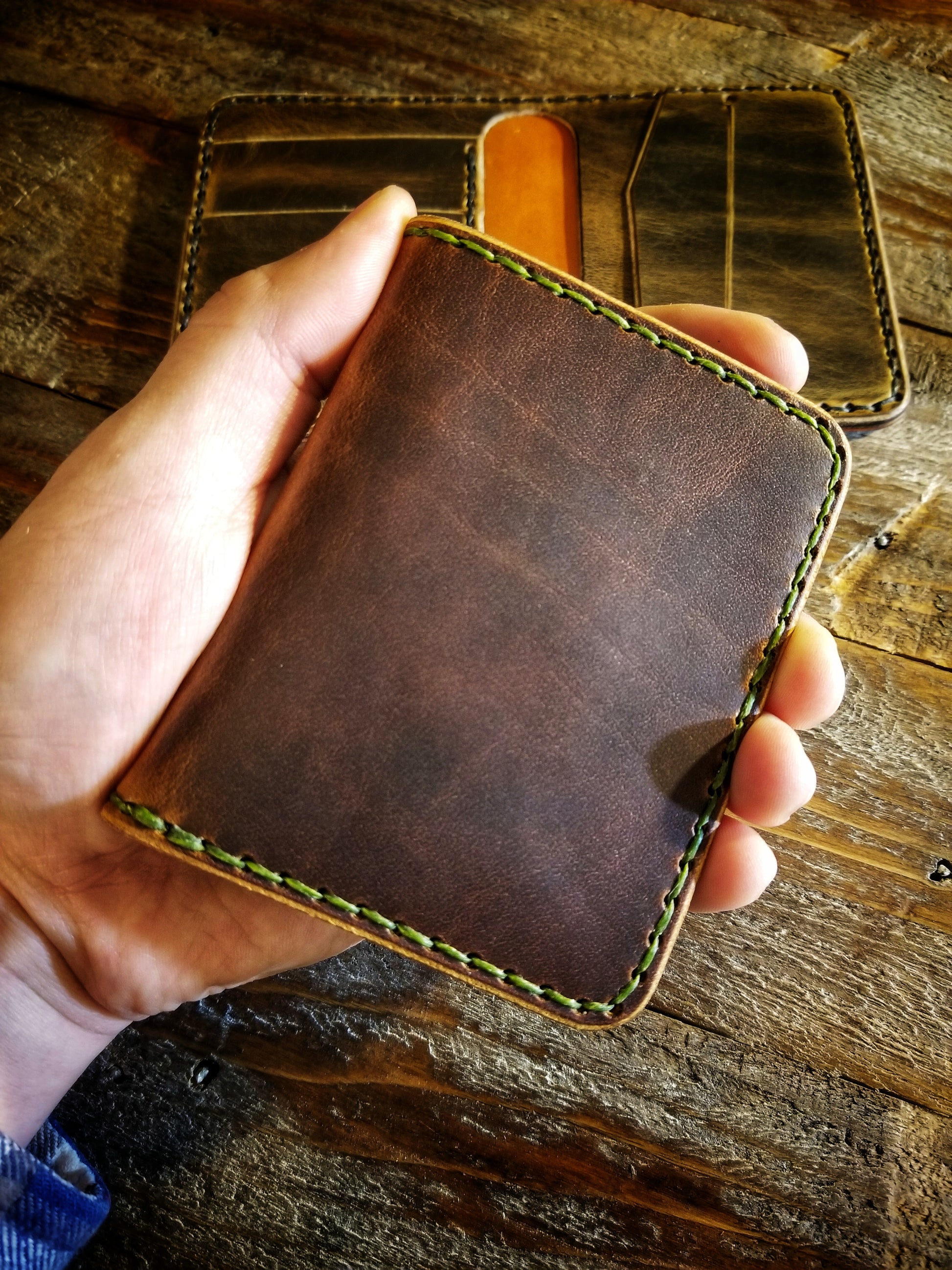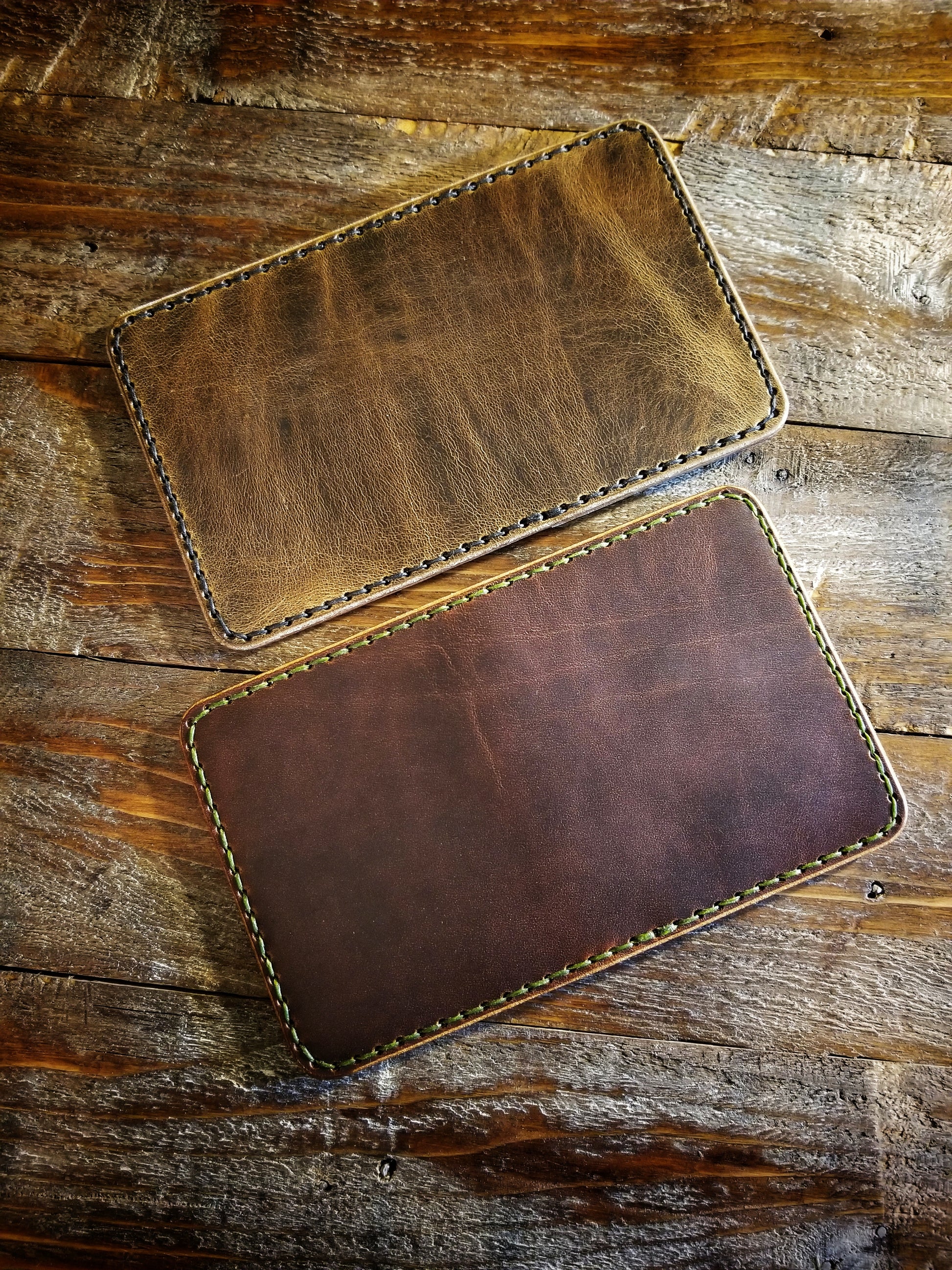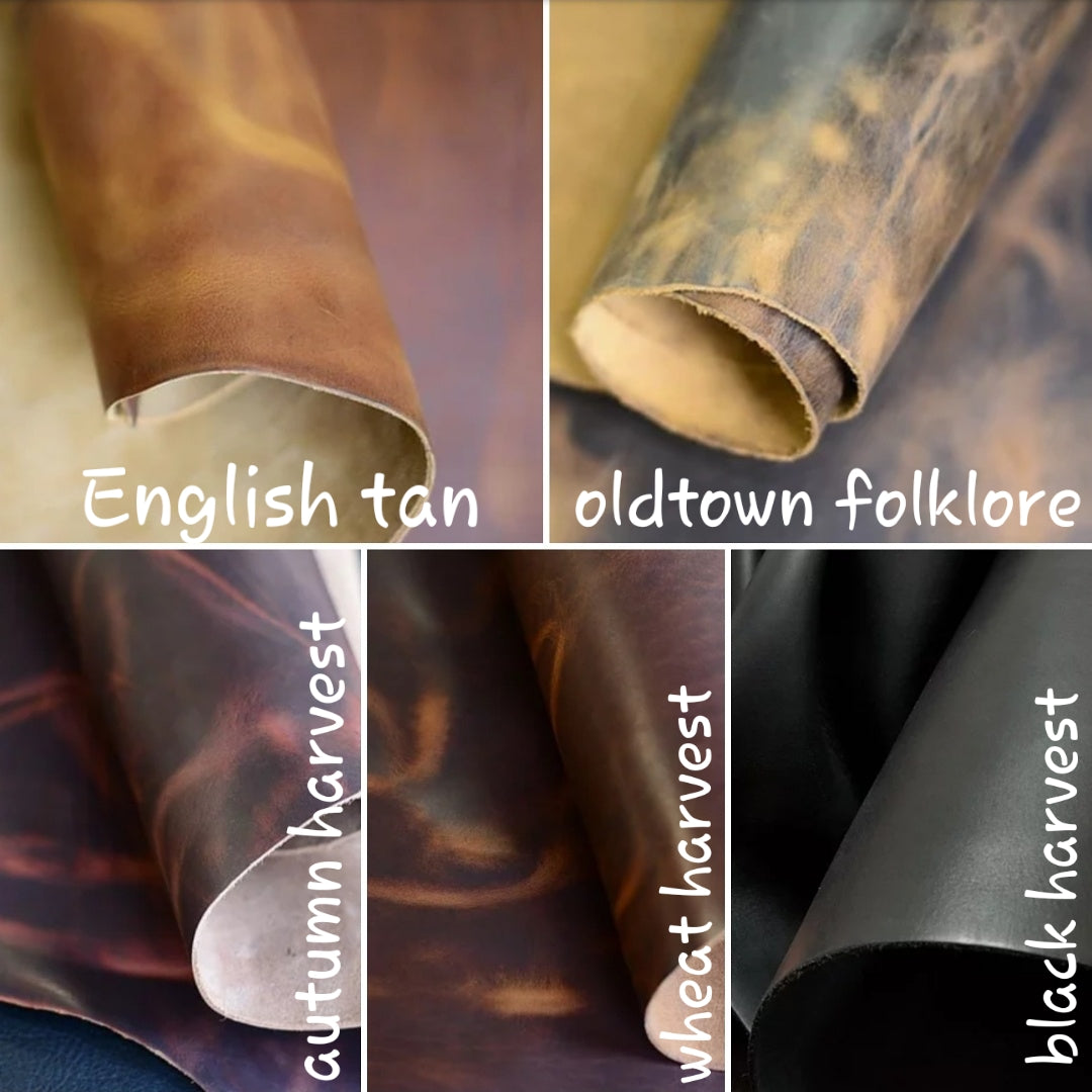 *Pictured in Autumn Harvest Leather with olive green thread, and Old Town Folklore Leather with black thread.