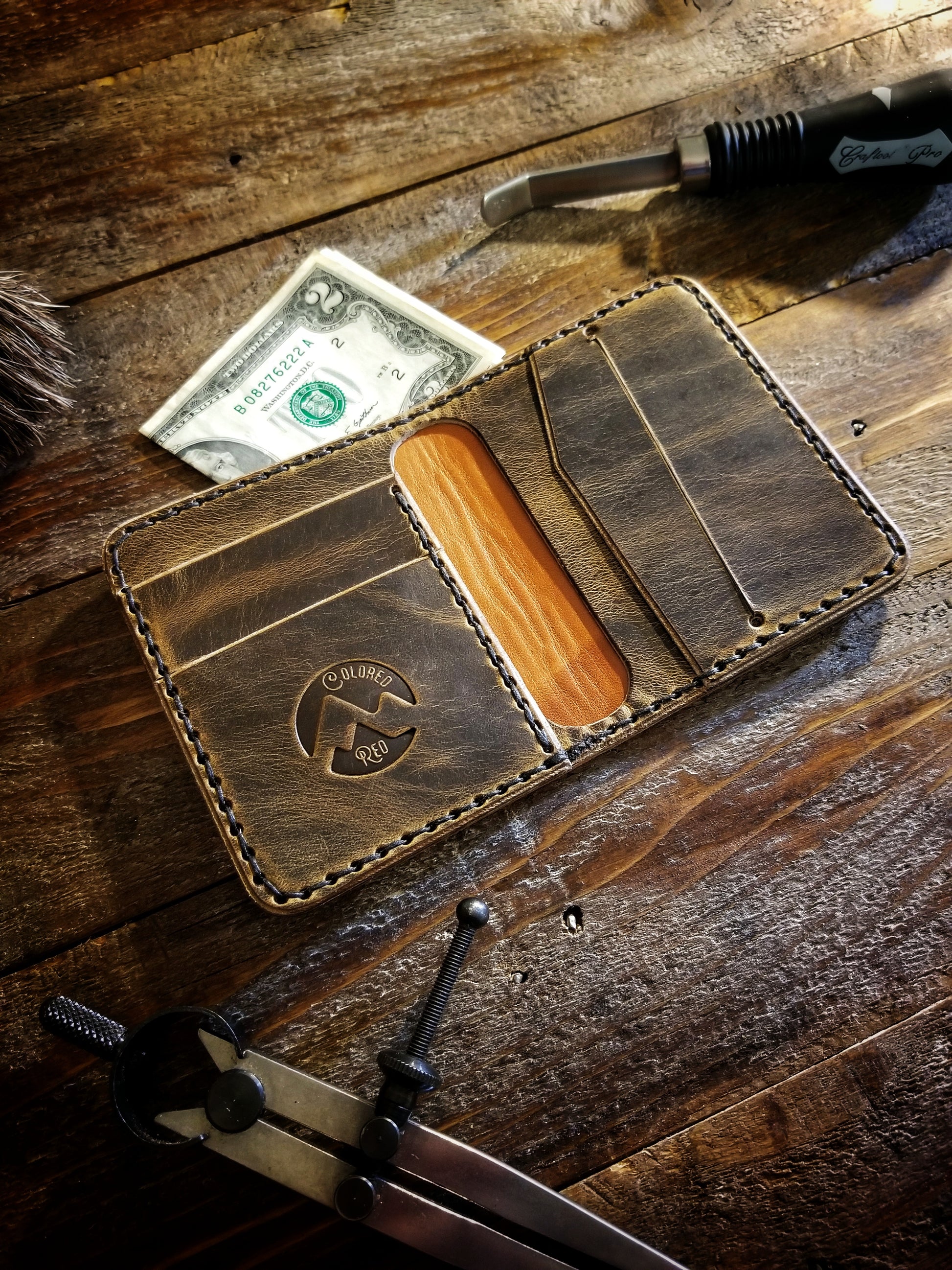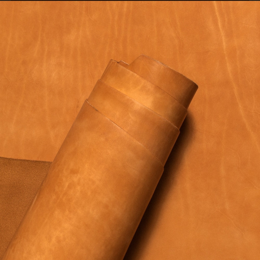 This is a 3-4 oz cowhide leather, which feels like it has already been broken in. It's not too soft and flimsy, but also not too stiff. This leather has a rich pull-up, and retains the feel and color for generations. Pull-up happens when the leather is bent or pulled making the oils move around within the cowhide, which causes the lighter tones to become visible. This leather is tanned in the USA, using USA cowhide, and is extremely durable.