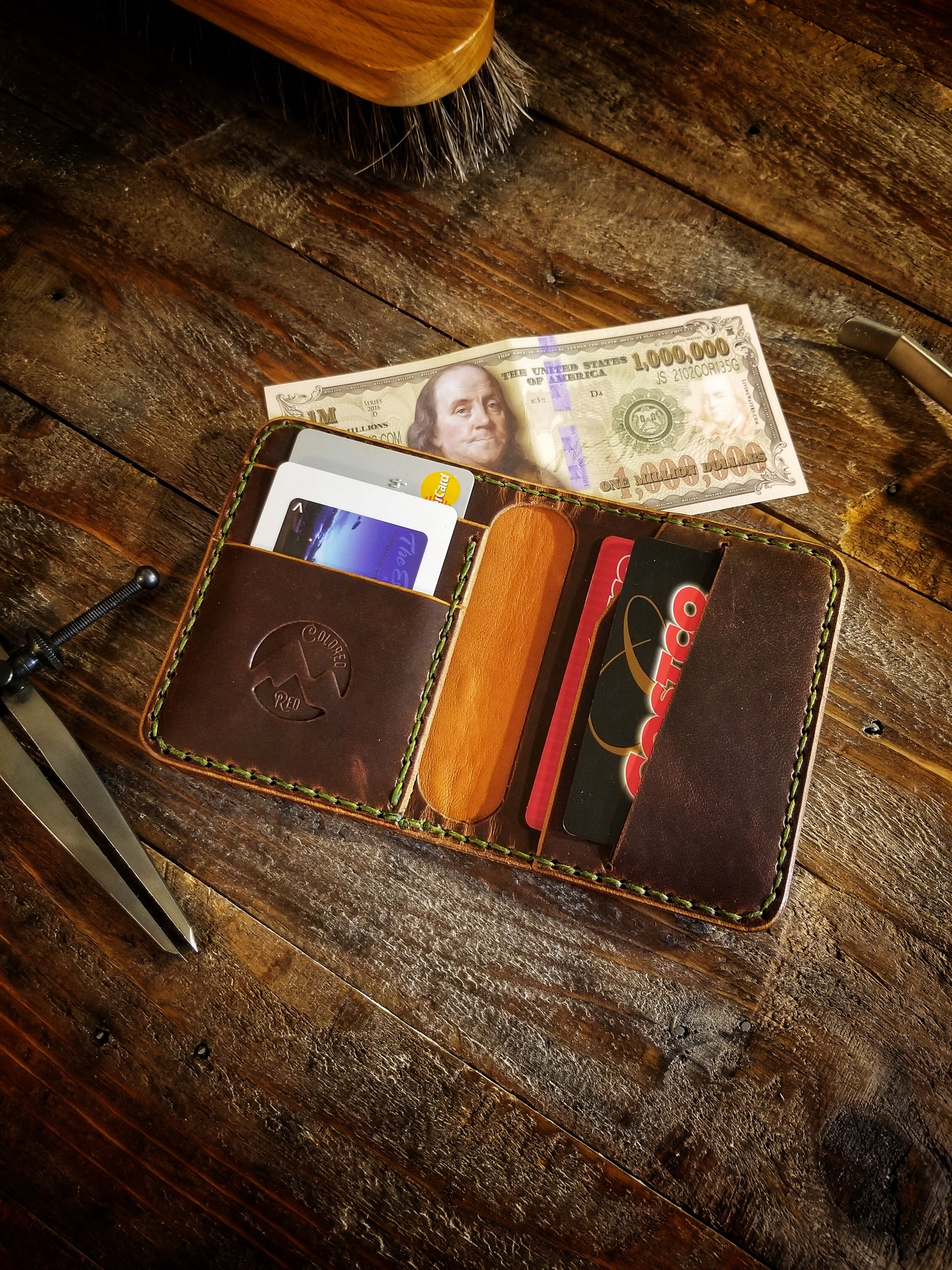 *The wallet measures 4 3/16"H x 3 1/2"W x 1/2"D (closed). A single layer of leather is approximately 1/16" thick.
